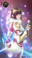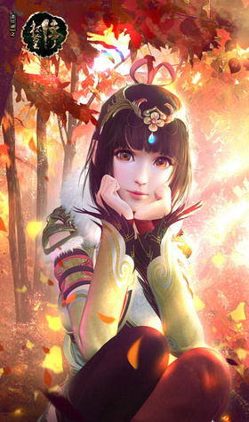 著裝以紅黃暖色係為主,且多鳳凰元素裝飾,以紅色髮帶、雙鳳凰髮飾裝飾頭髮。肌膚勝雪,美目流盼,點絳朱唇,桃腮帶笑,氣若幽蘭,說不盡溫柔可人。
