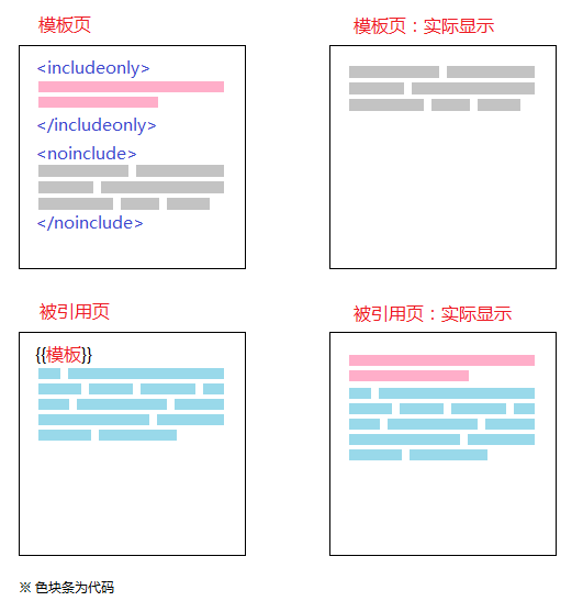 <includeonly>標識的作用跟<noinclude>標識的作用正好相反,是將<includeonly>和</includeonly>之間的文本不加入所在的模板頁中,而加入調用模板的頁面中。